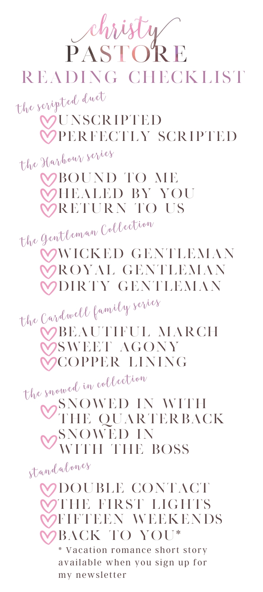 In this series, all book are considered complete standalones. This is the suggested reading order to enjoy the series fully.